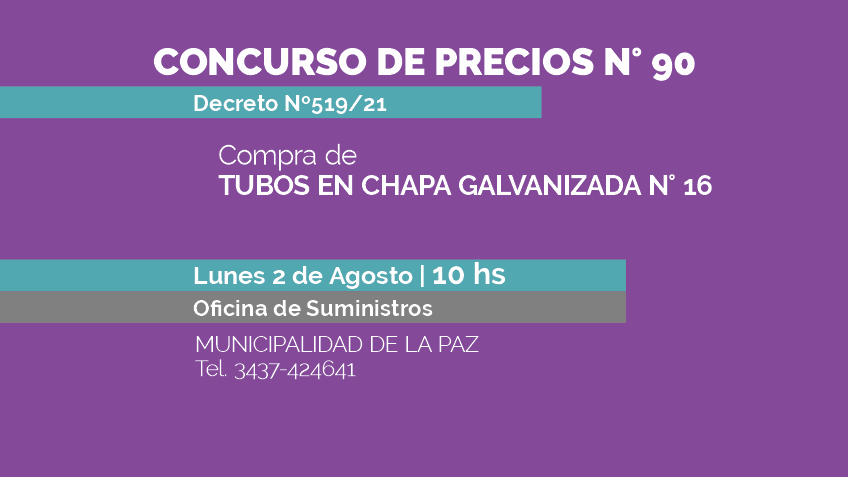 El Gobierno de la Municipalidad de La Paz, invita a partcipar del Concurso de Precios N° 90"TUBOS EN CHAPA GARVANIZADA N°16", con el objeto de elevar el proyecto de "mejoramiento de desagues pluviales" en calle Jacaranda y Tratado de Alcaraz. La fecha de apertura es el dia Lunes 2 de agosto del corriente año a las 10.00 horas. El mismo, tendrá lugar en la Oficina de Suministro ubicada en calle Echague y Moreno.