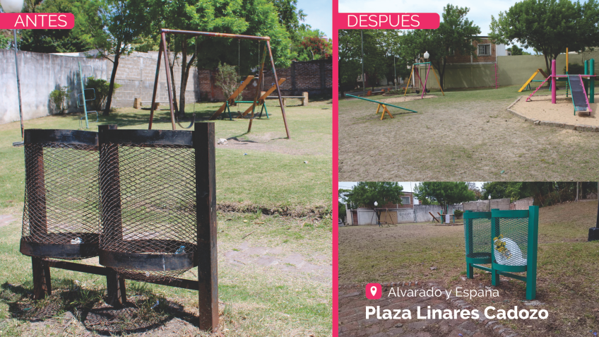 Aquí mejoramos el parquizado y canteros, pintamos los juegos, cestos y mampostería de la plaza, además de la reposición y reconstrucción los elementos de juego para chicos.